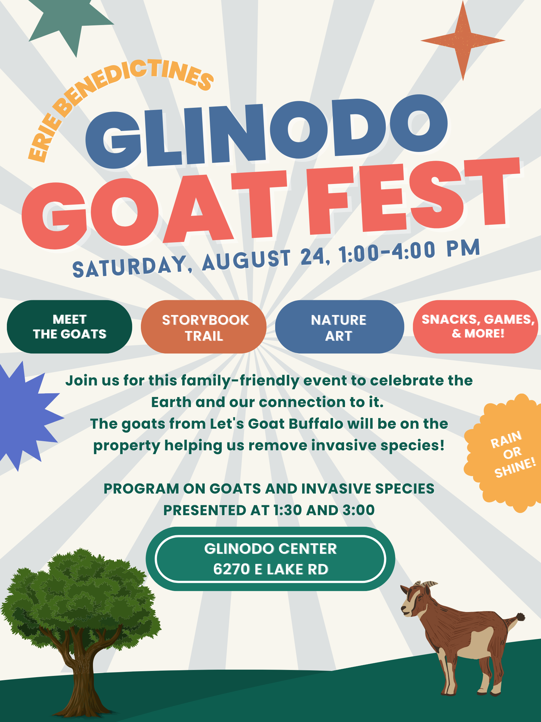 Goat Fest is family-friendly and free – join us for a storybook trail, nature art, snacks, and games. The Mercyhurst University Office of Sustainability will be present for some activities and education as well. There will be a brief presentation from the goatherds at 1:30 and again at 3:00 about the goats and how the rid the area of invasive species. Of course, there will also be opportunity to meet the goats.